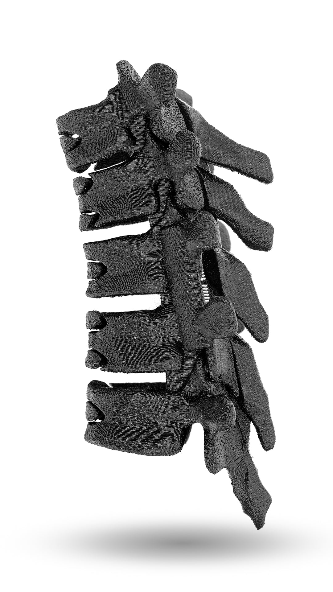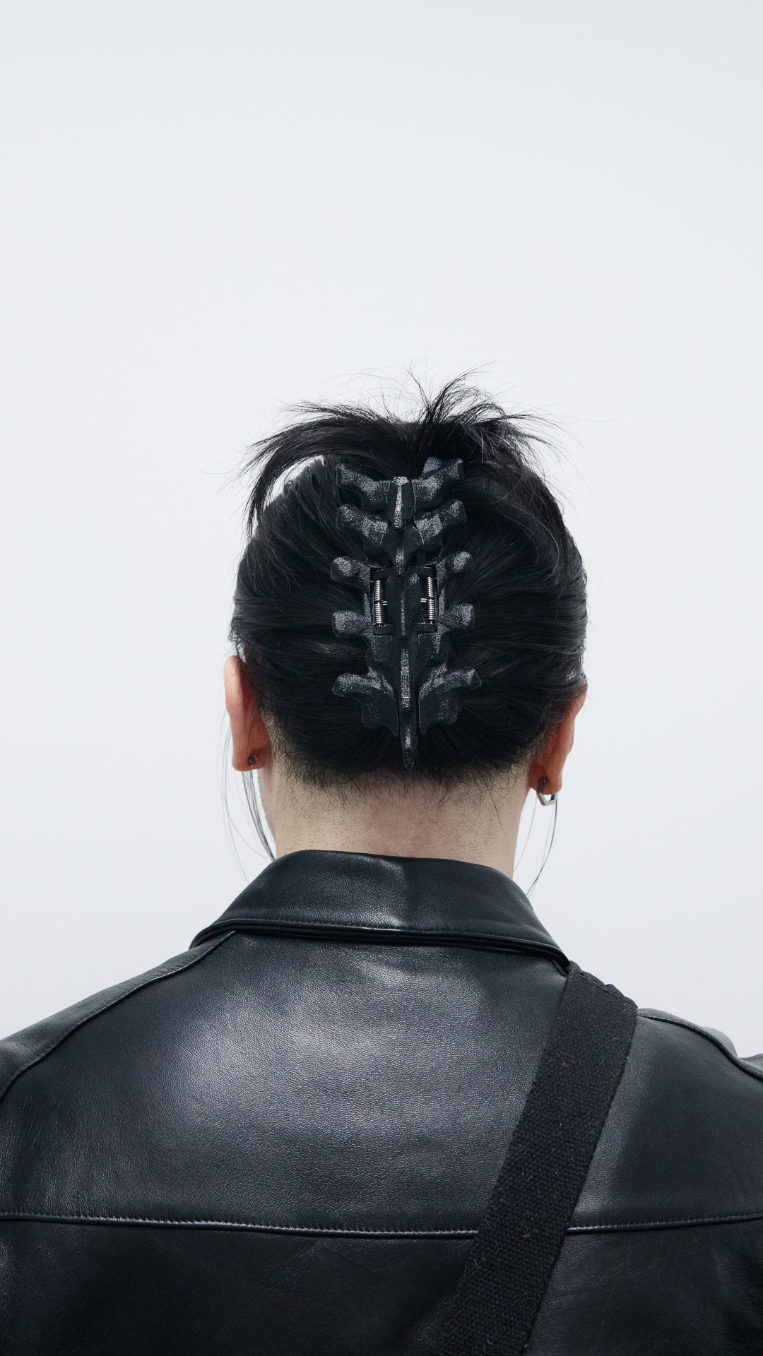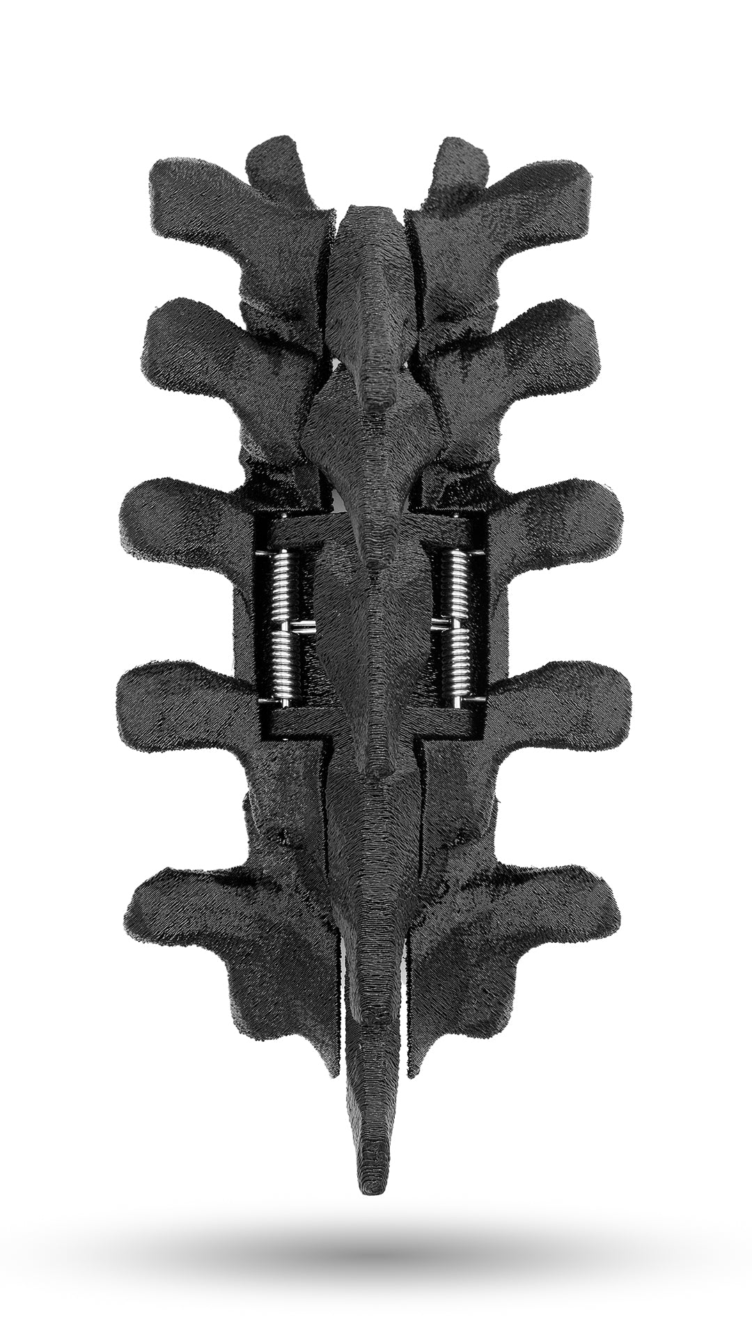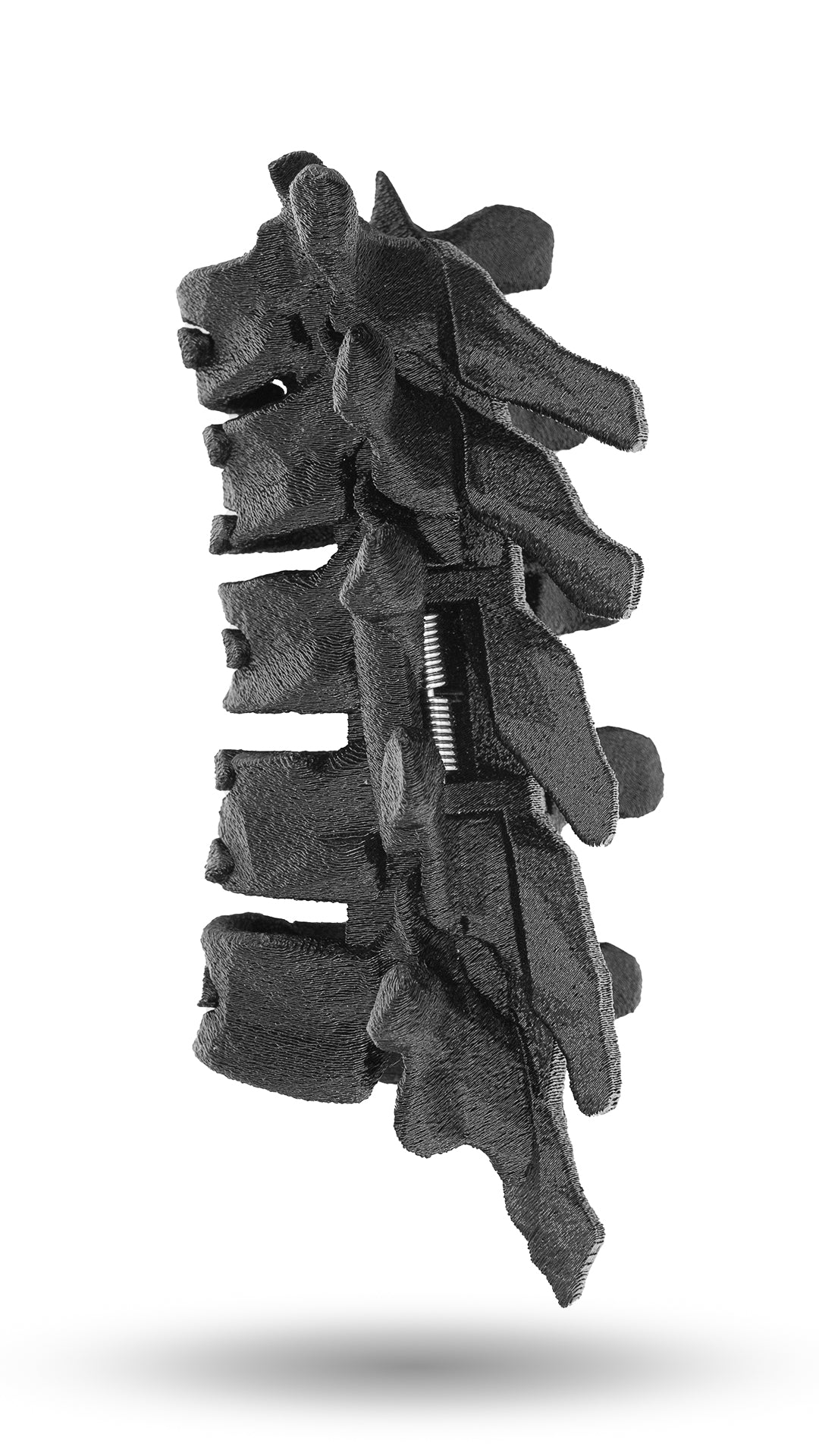 I designed the unique dual-axis mechanism with quad springs, which allows the side wings to move freely and exert even pressure on your hair without interfering the spinous processes in the back. This allows the hairclip to be used like any standard hair clip using the finger groove on the 4th vertebrae. Nearly everything is made in my studio, from the printing of the TPU to the hand-wound springs to the embossing of the packaging.